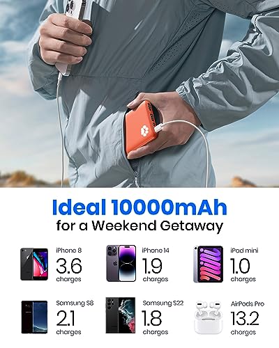 - Market's Thinnest 10000mAh: The market’s one and only 0.5-inch power bank that breaks the limit of 10000mAh, easily slipped into any travel lover's pockets or bag. Enjoy the days’ worth of charging capacity, enough to top up iPhone 8 3.6 times, Samsung S22 1.8 times, or AirPods Pro 13.2 times.